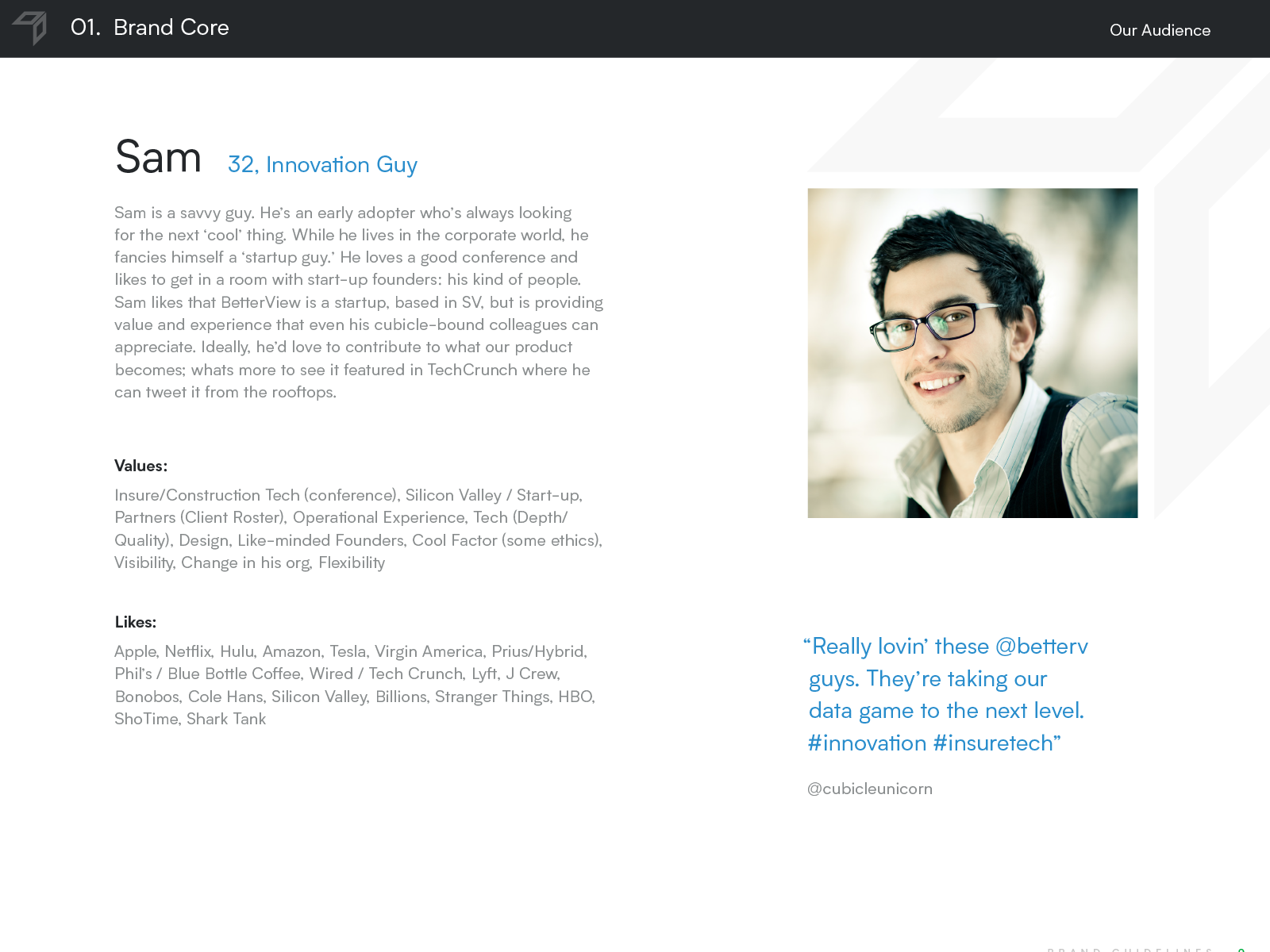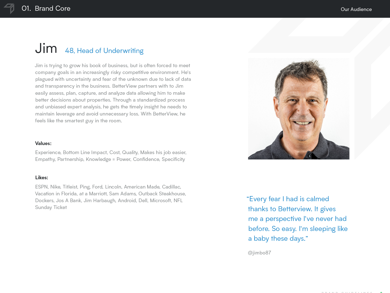 We worked to understand the customer from a brand and user perspective. We created personas of our primary audiences and wrote stories about them to paint a picture of what their life is like and how Betterview makes it better.