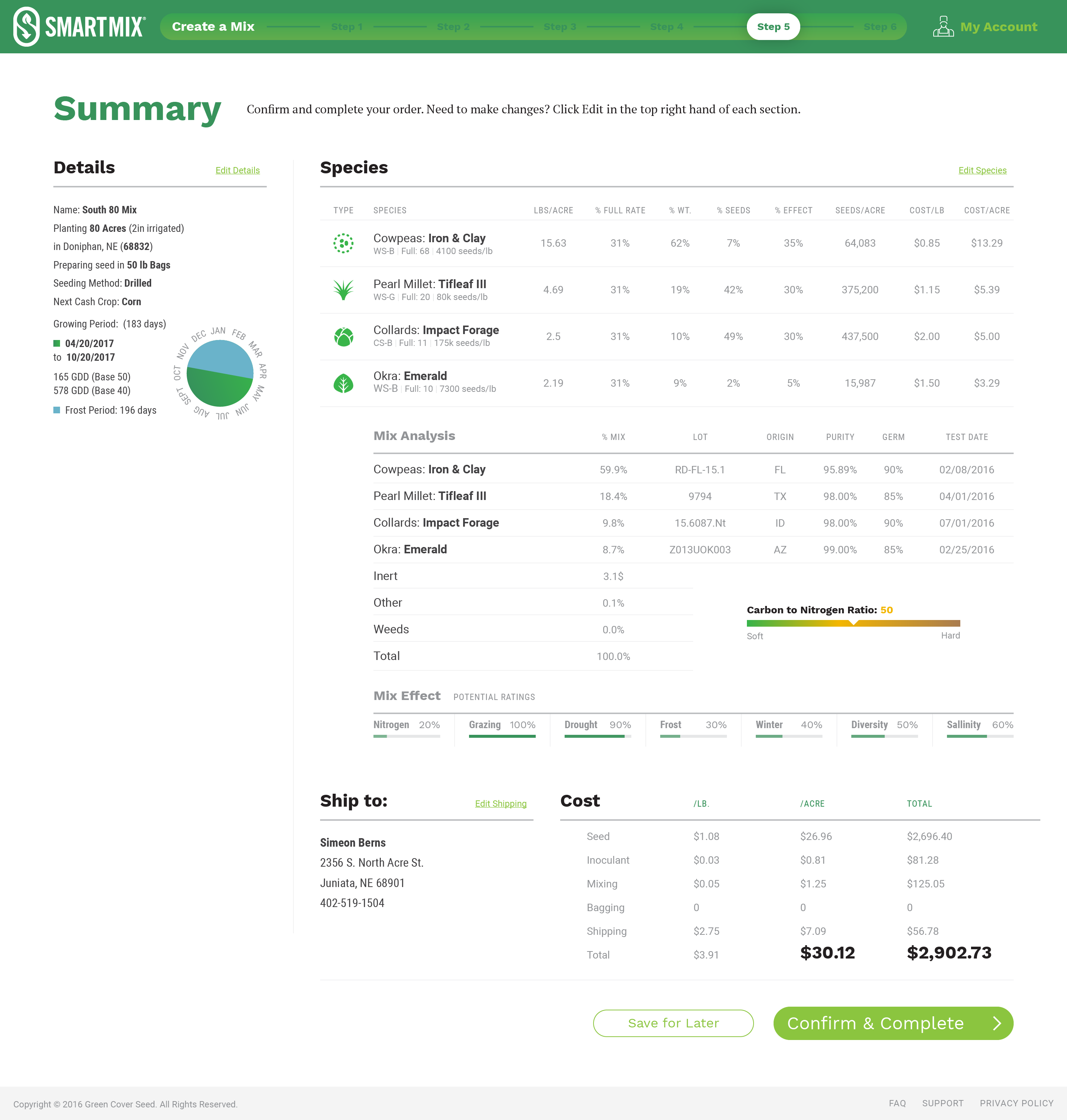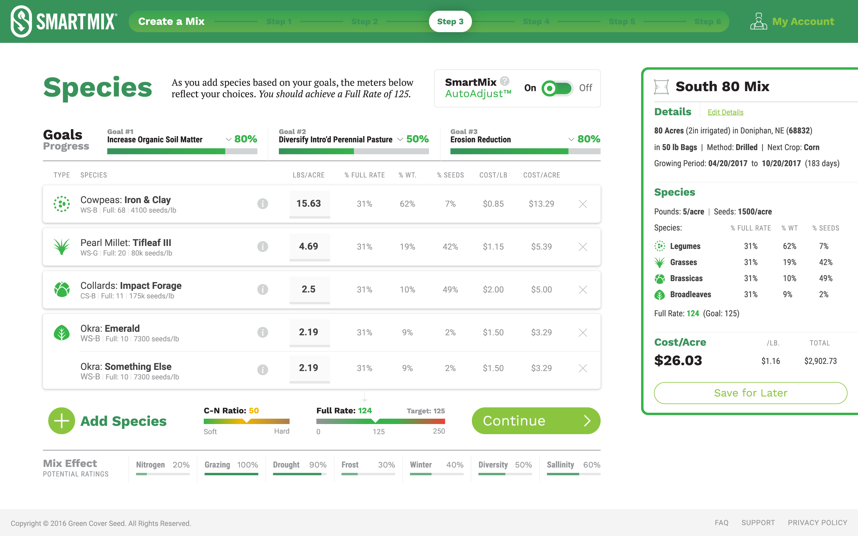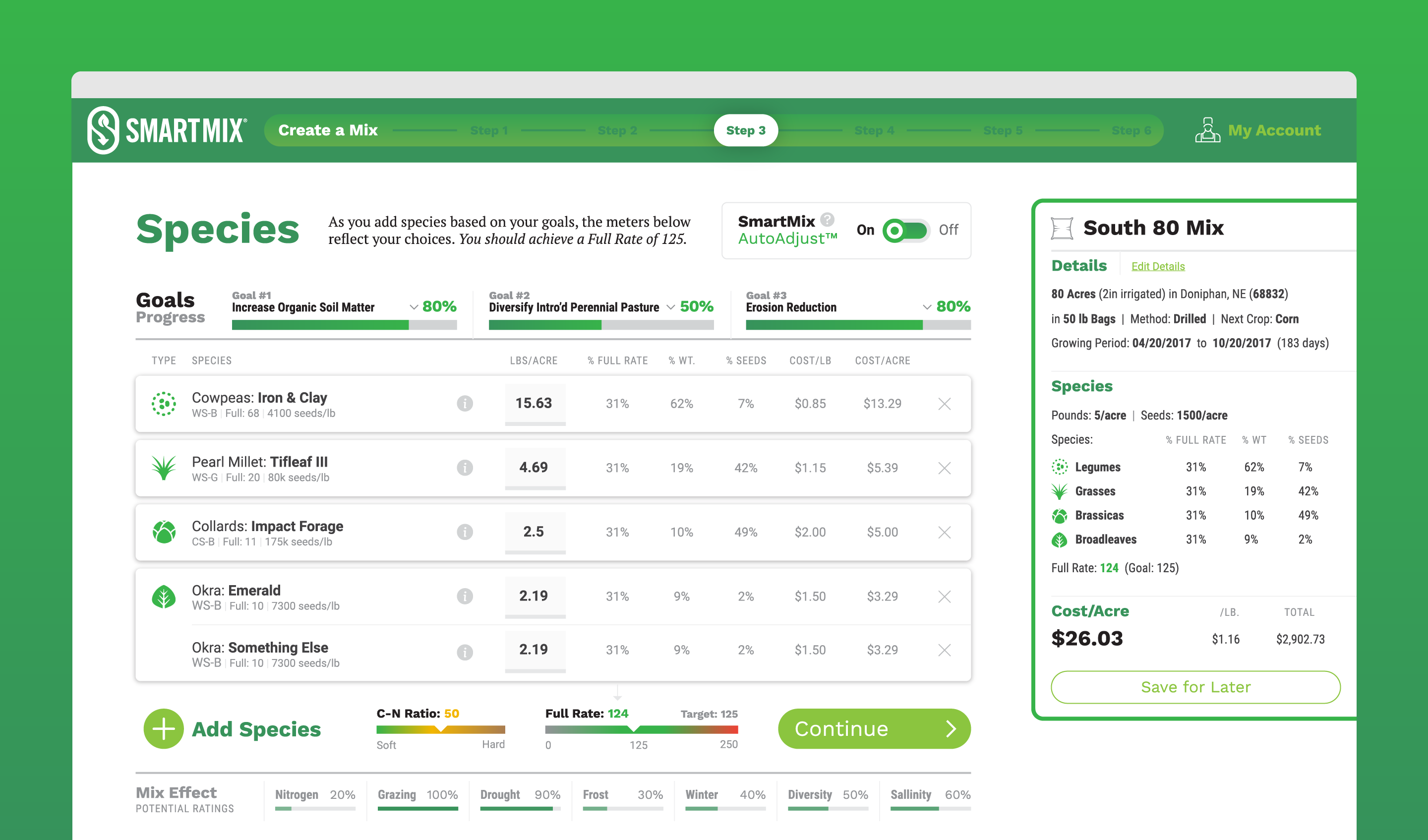 Green Cover Seed mixes very complex configurations of seed for farmers who are growing cover crops to replenish the soil on their fields. Each type of cover crop offers different types of value for the soil such as nitrogen fixation, erosion reduction, weed suppression, etc. They wanted to develop an application called SmartMix that would allow farmers to build these mixes online, and to project the results in real-time as they were building their configuration.