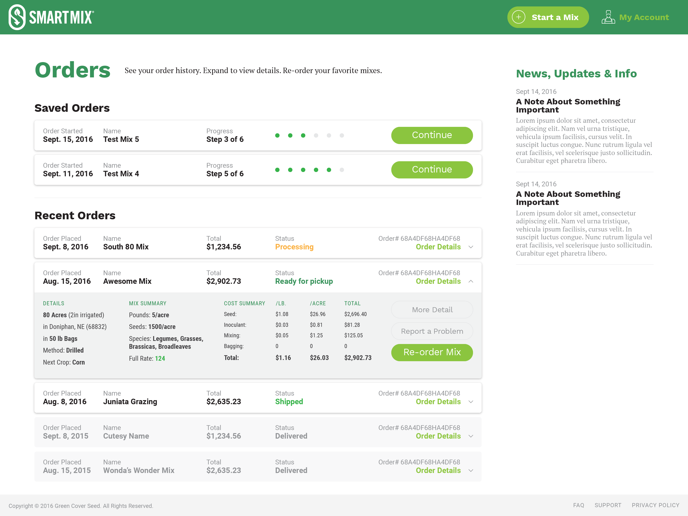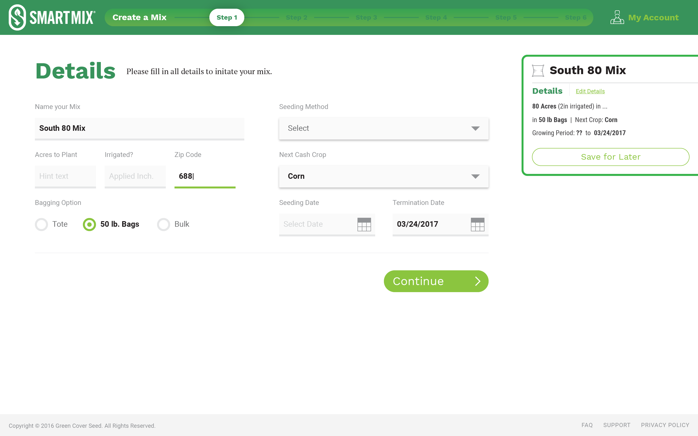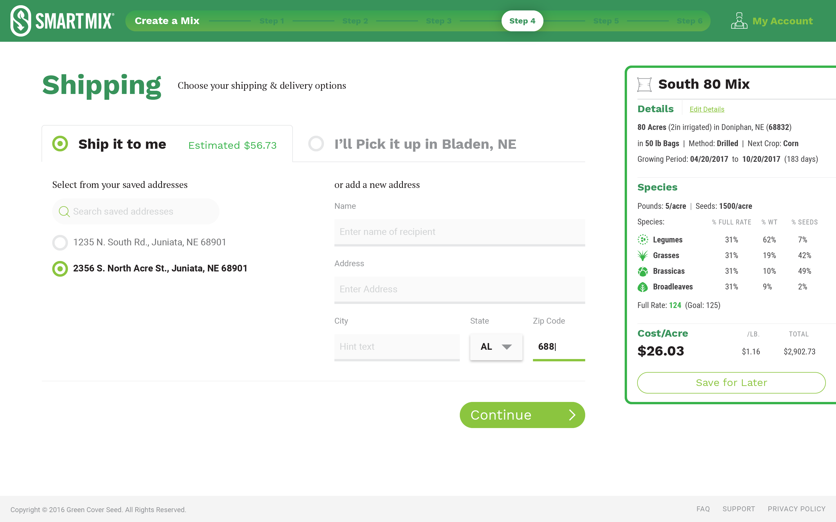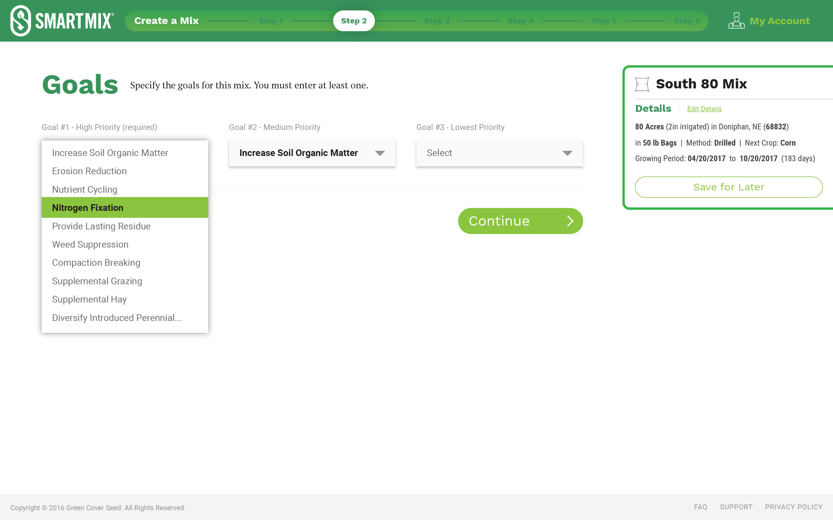 Green Cover Seed mixes very complex configurations of seed for farmers who are growing cover crops to replenish the soil on their fields. Each type of cover crop offers different types of value for the soil such as nitrogen fixation, erosion reduction, weed suppression, etc. They wanted to develop an application called SmartMix that would allow farmers to build these mixes online, and to project the results in real-time as they were building their configuration.